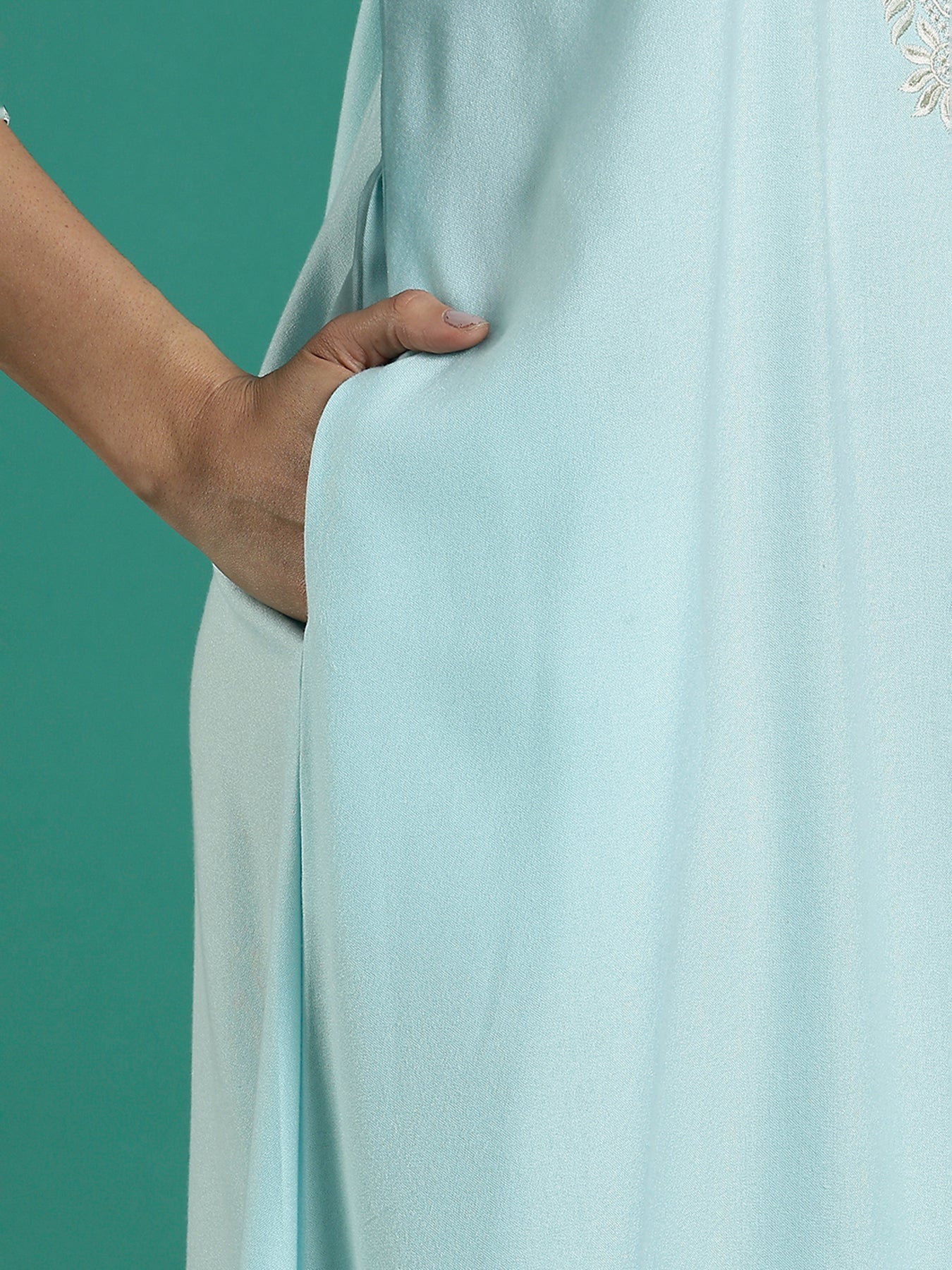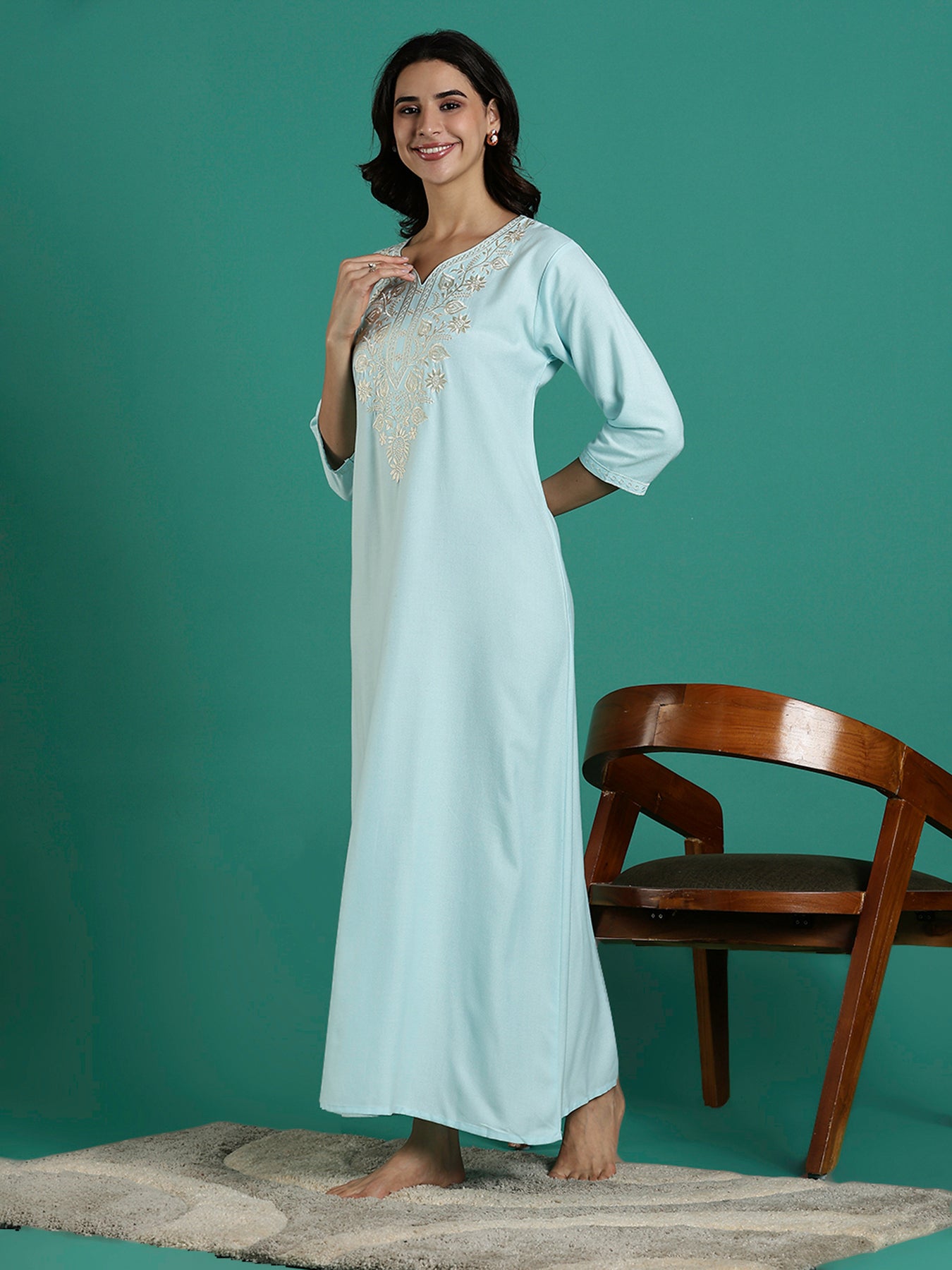 Relax in soothing shades with this aqua blue embroidered nighty for women, a design crafted for women who love elegance with ease. The pastel aqua shade feels light and refreshing, while the soft Alpine blend fabric flows smoothly against the skin. Intricate embroidery on the neckline adds a graceful touch, paired with an irritation-free lining for everyday comfort.