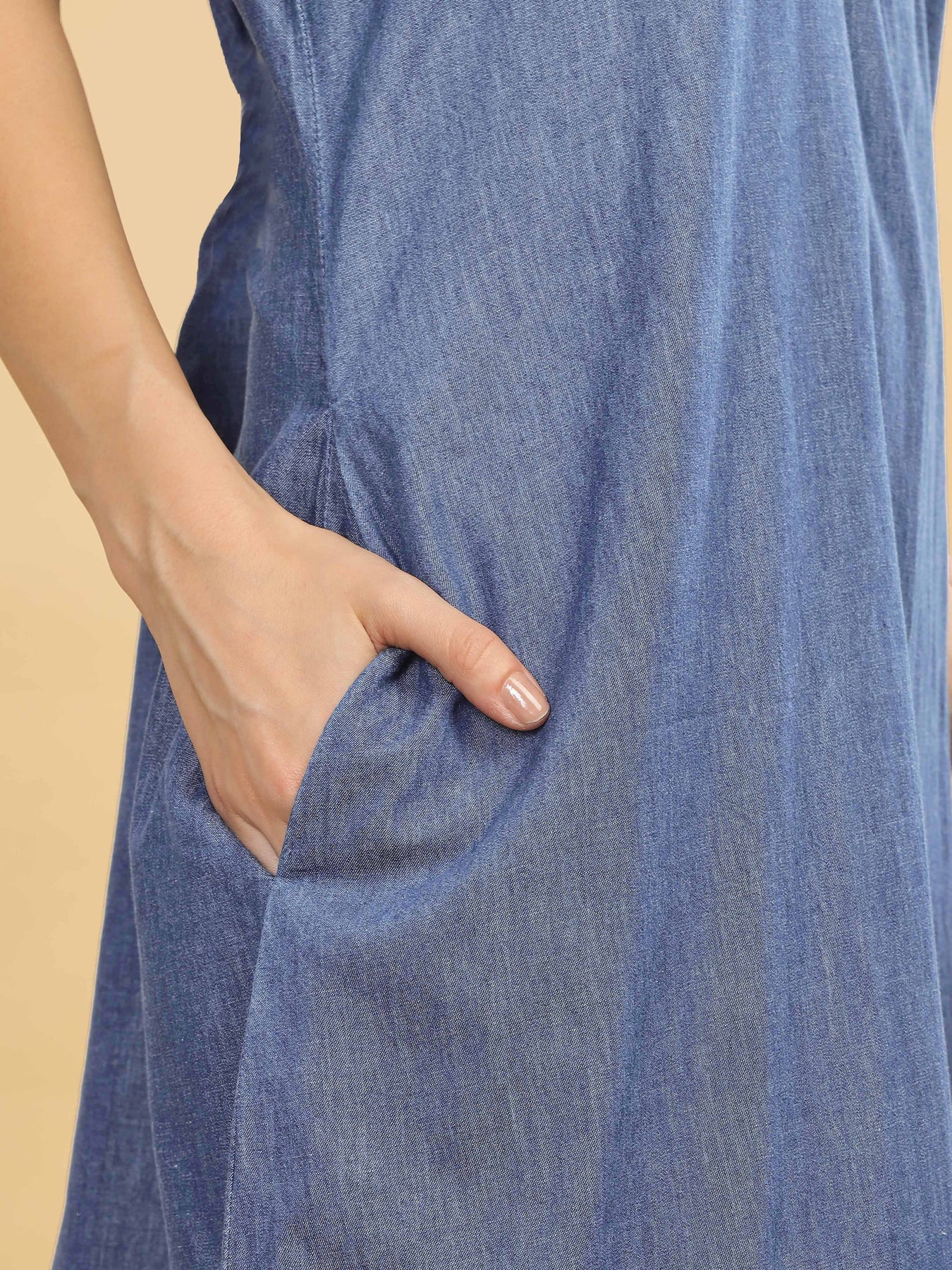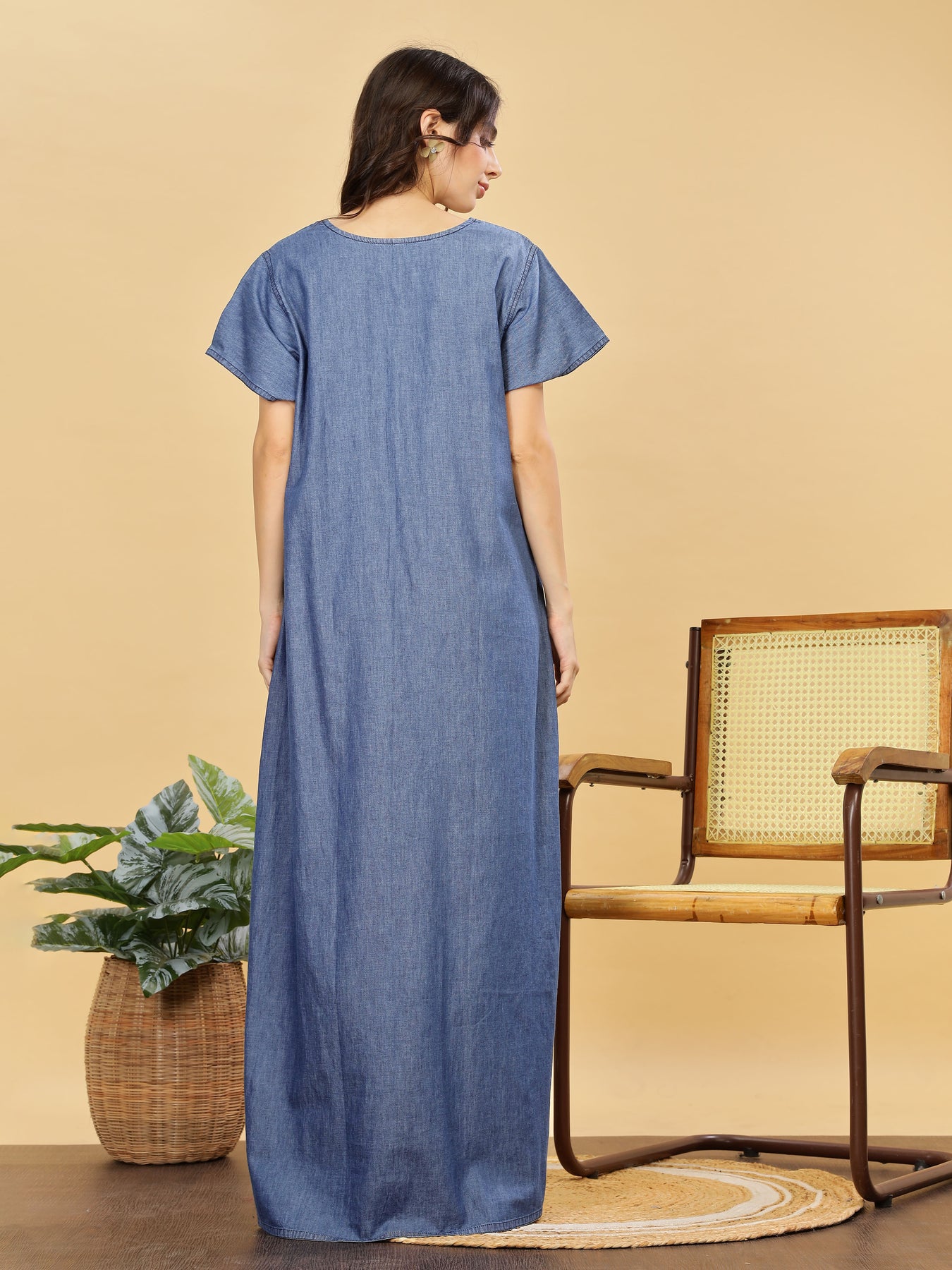 Soft Cotton Denim Embroidered Maxi Nighty for Women with Pocket and Button Neckline