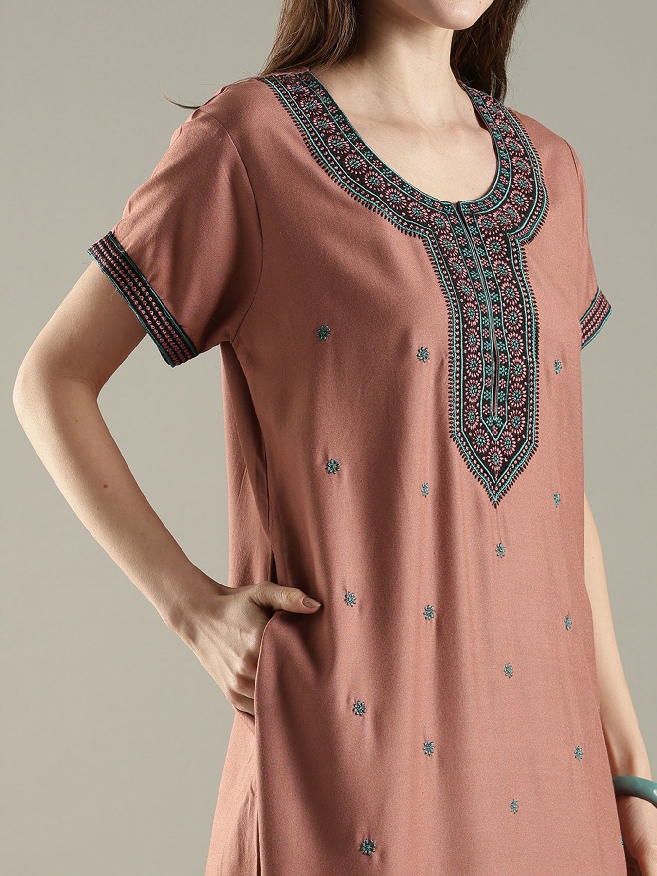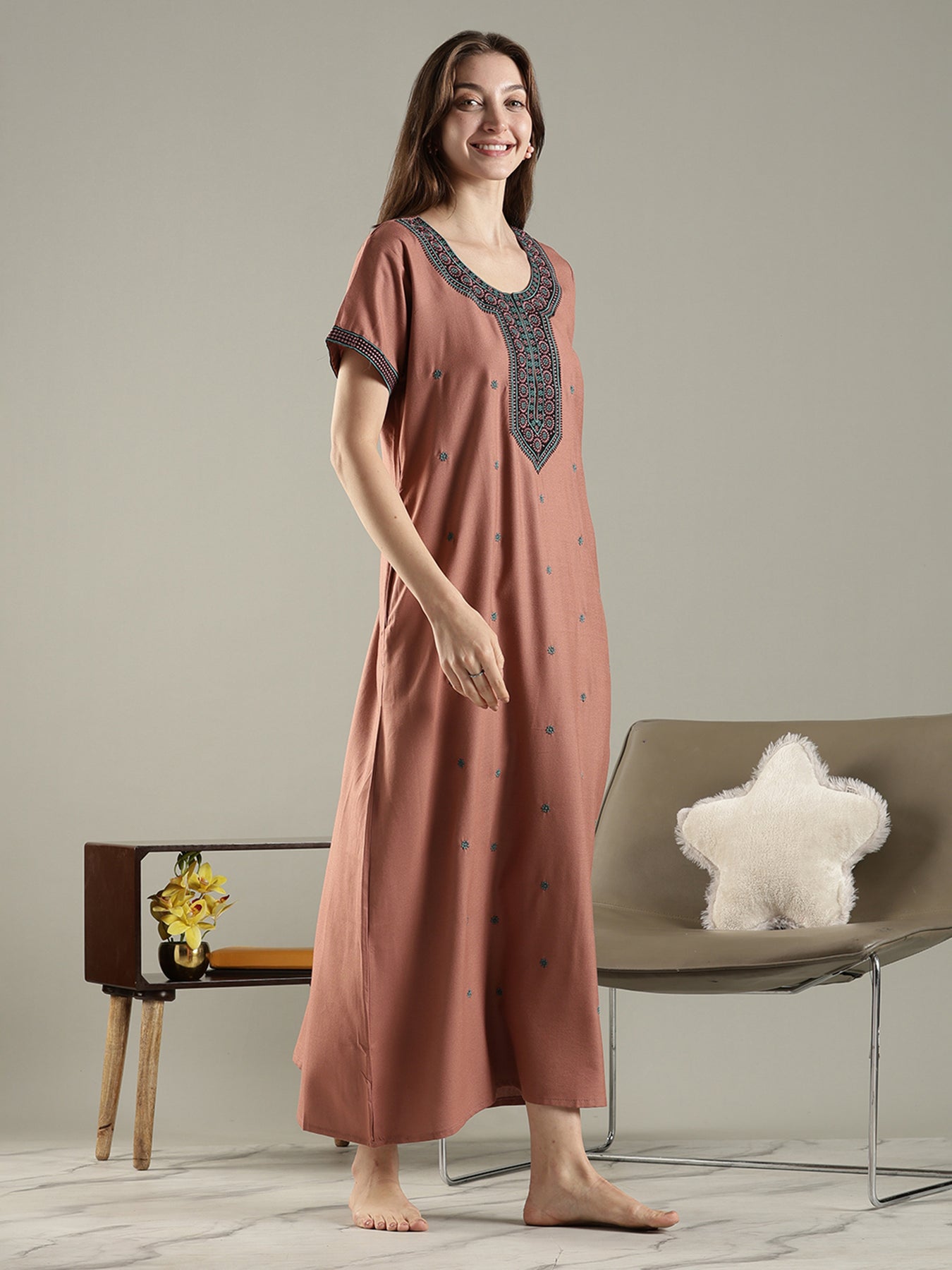 Rose brown alpine ethnic embroidered nighty for women