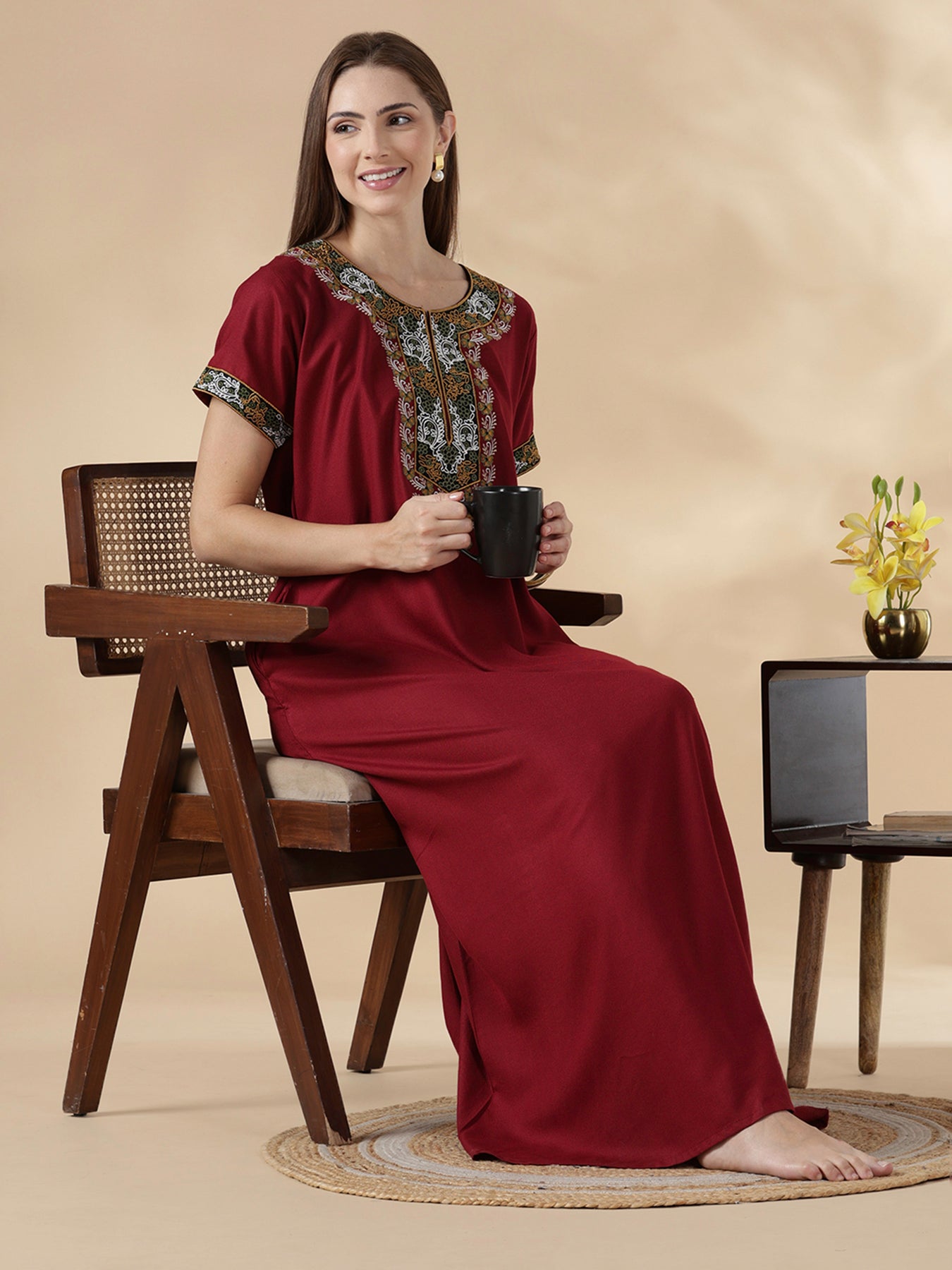 The beautifully embroidered U-shaped yoke features paisley and floral motifs inspired by Indian heritage art. Short sleeves with matching embroidered borders and a functional side pocket add both style and convenience, making it perfect for nightwear, lounging, or calm mornings.
