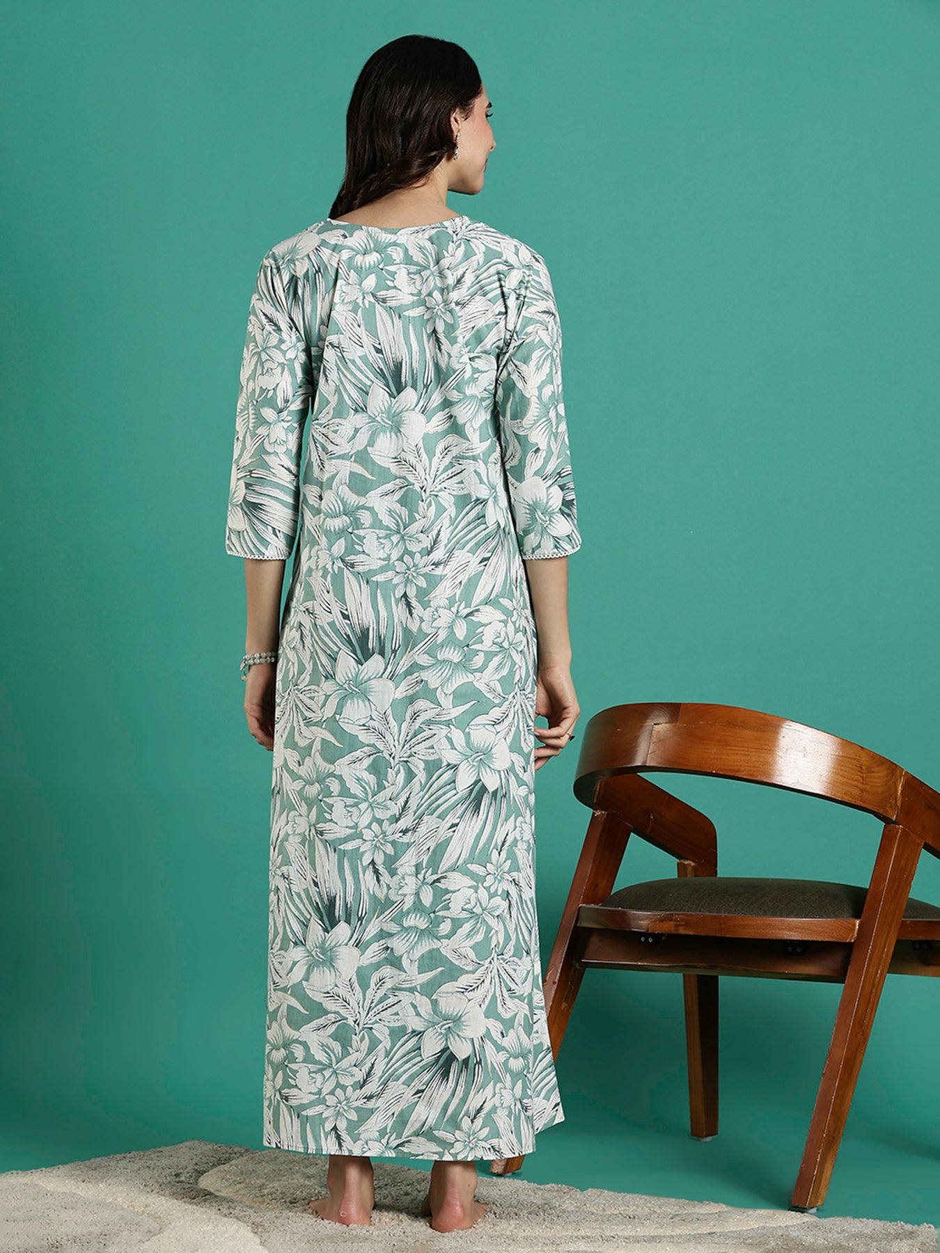 Green Pure Embroidered Cotton Nighty with 3/4 Sleeve