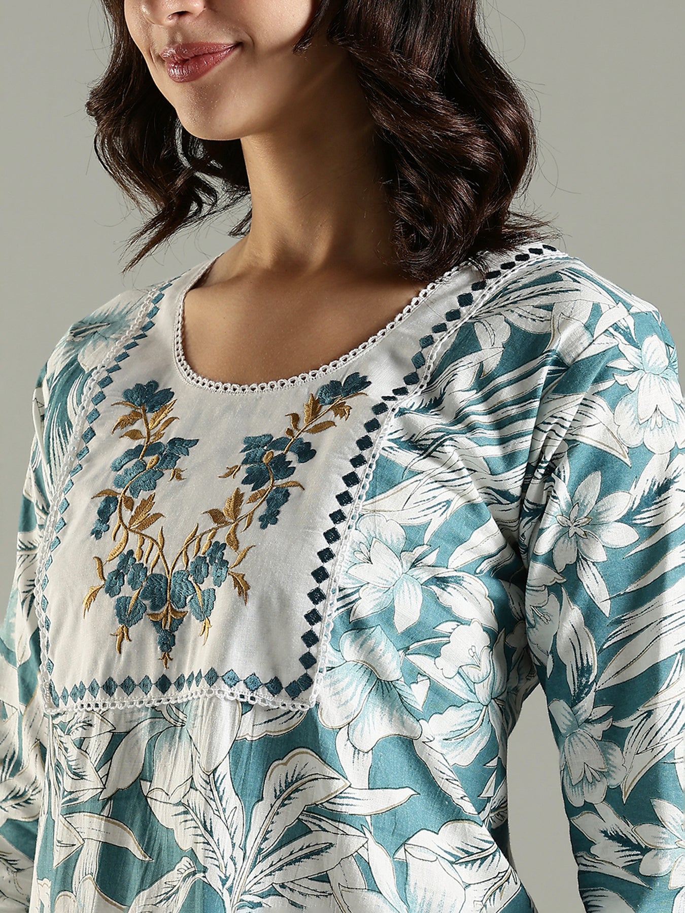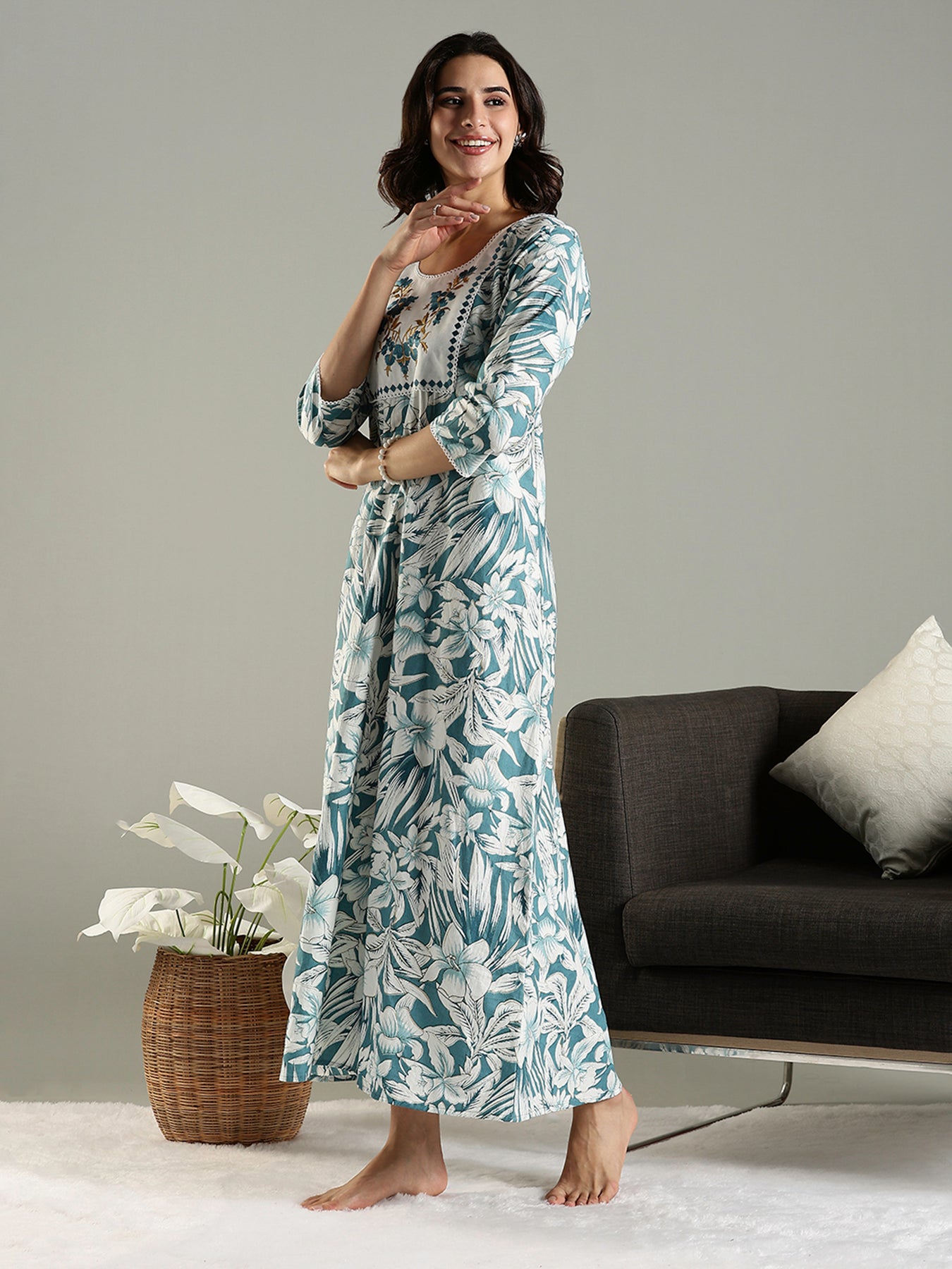 Blue Floral Pure Cotton Nighty with Embroidered Yoke