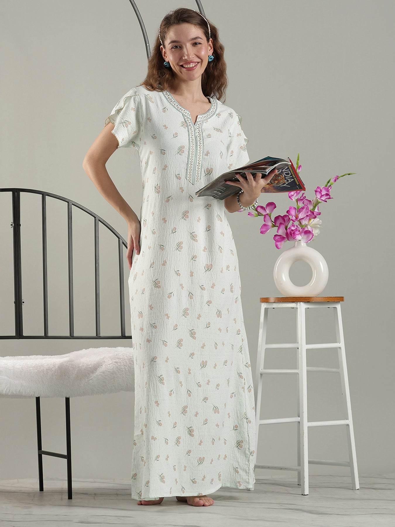 Crafted in soothing Misty Green, this cotton crush nighty blends soft texture with delicate tulip-bud florals for a relaxed, airy feel. The embroidered neckline and flutter sleeves add gentle elegance, making it perfect nightwear for women who enjoy cool, breathable comfort through peaceful evenings and easy mornings.