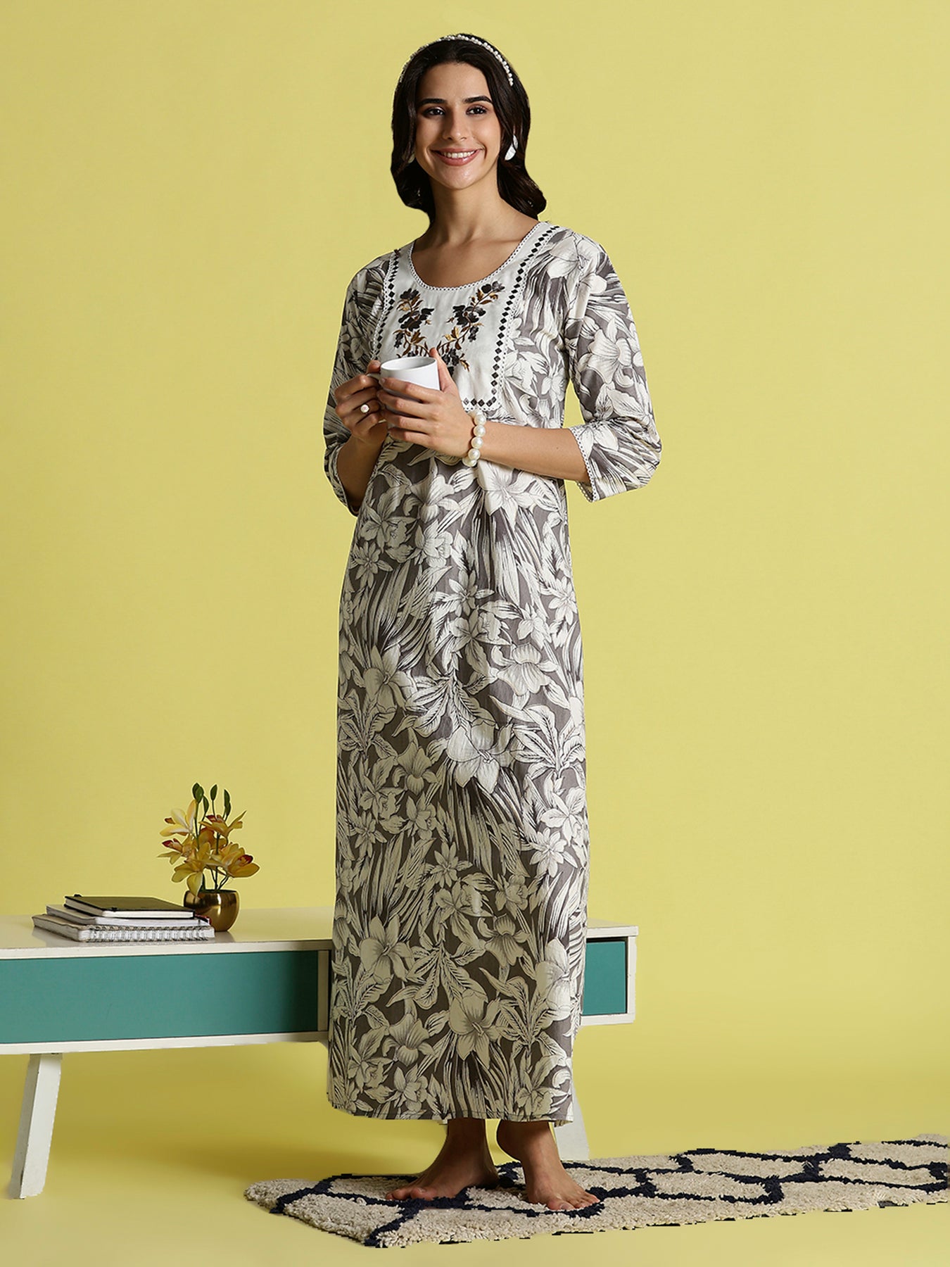 Grey Pure Cotton Embroidered Nighty – Subtle Elegance Meets Ease