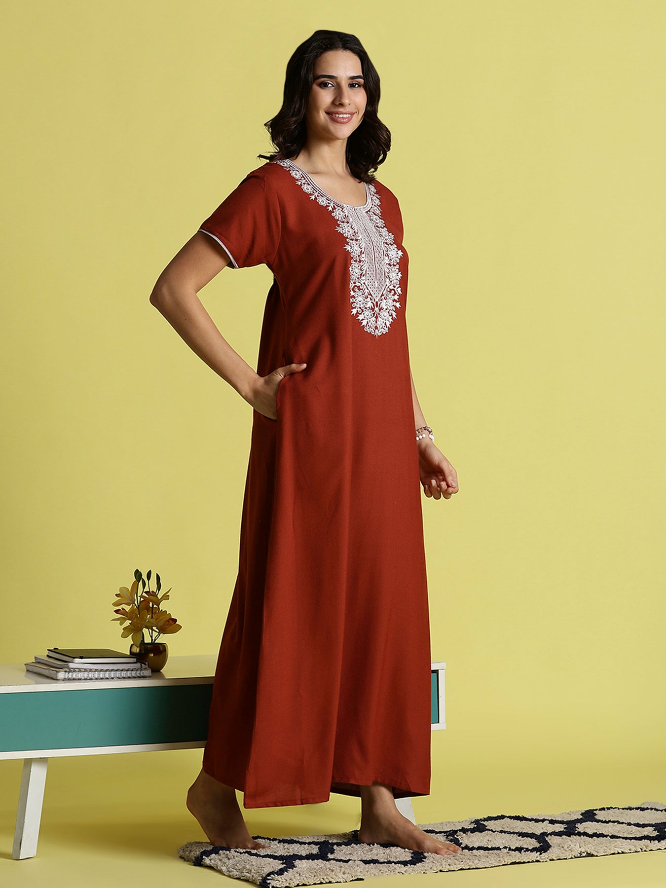 Sadabahar Orange Alpine Embroidered A-Line Designer Nighty with Pocket