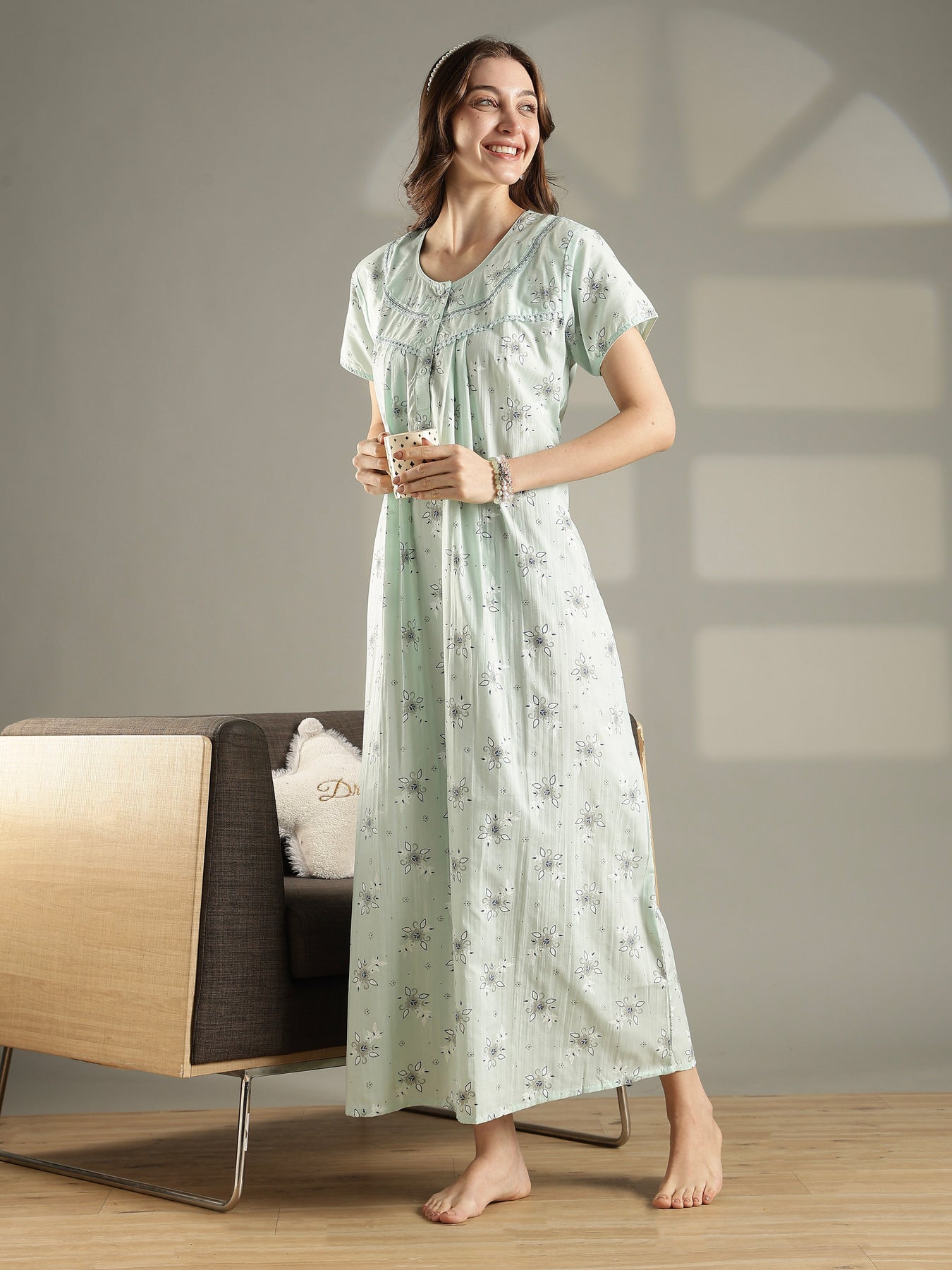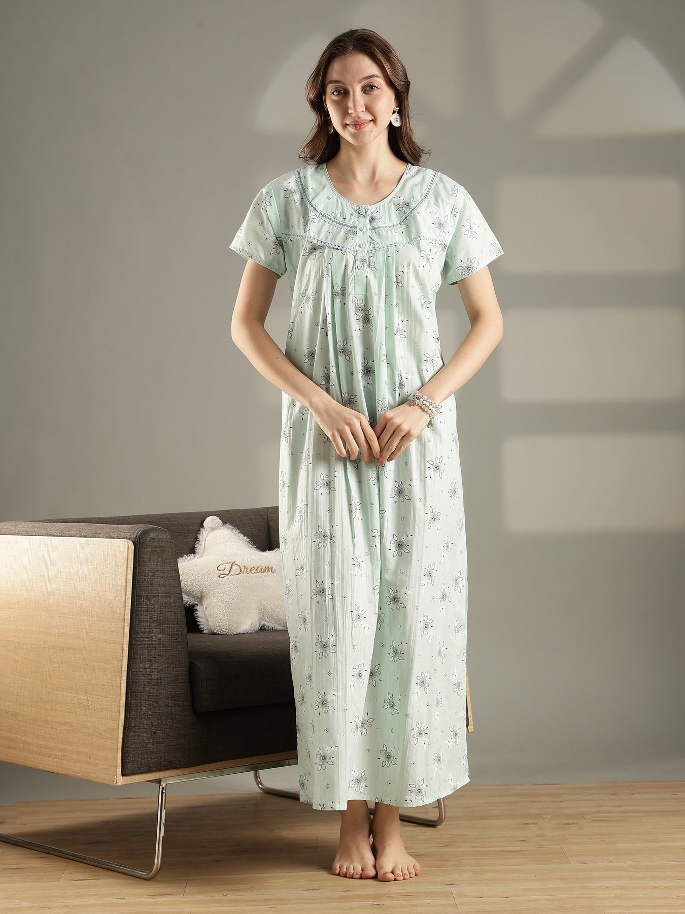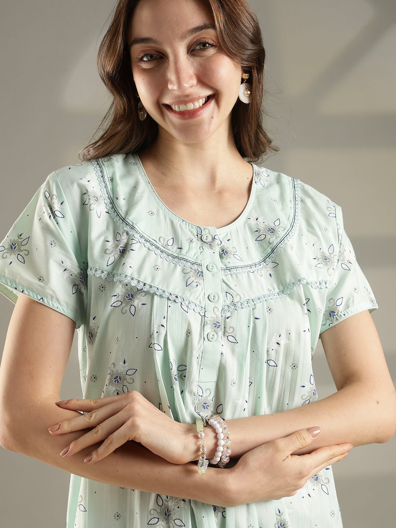Pastel Green Floral 100% Pure Cotton Nighty for Women Relaxed Fit