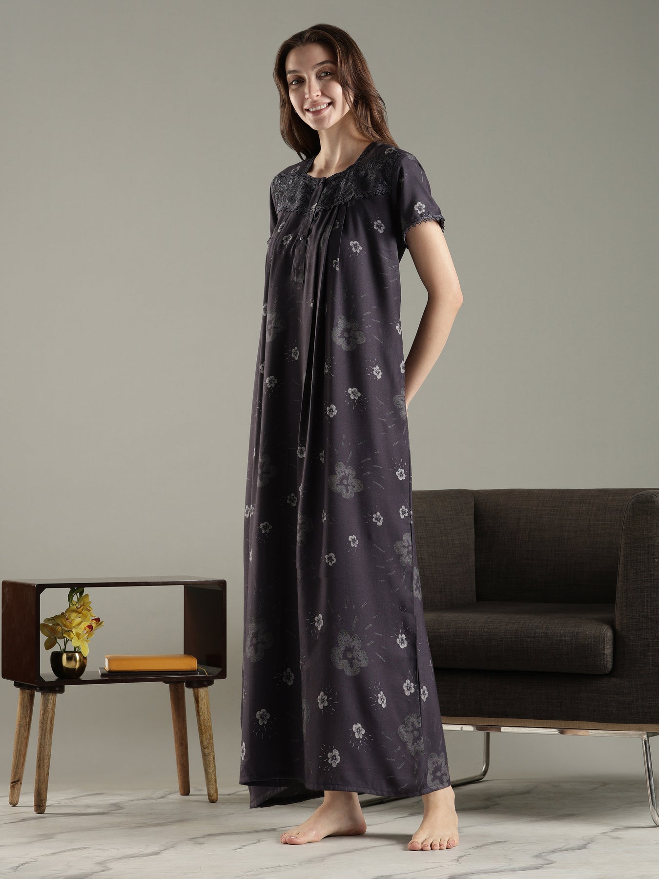Alpine Pleated Floral Nighty for Women with Lace Detailing