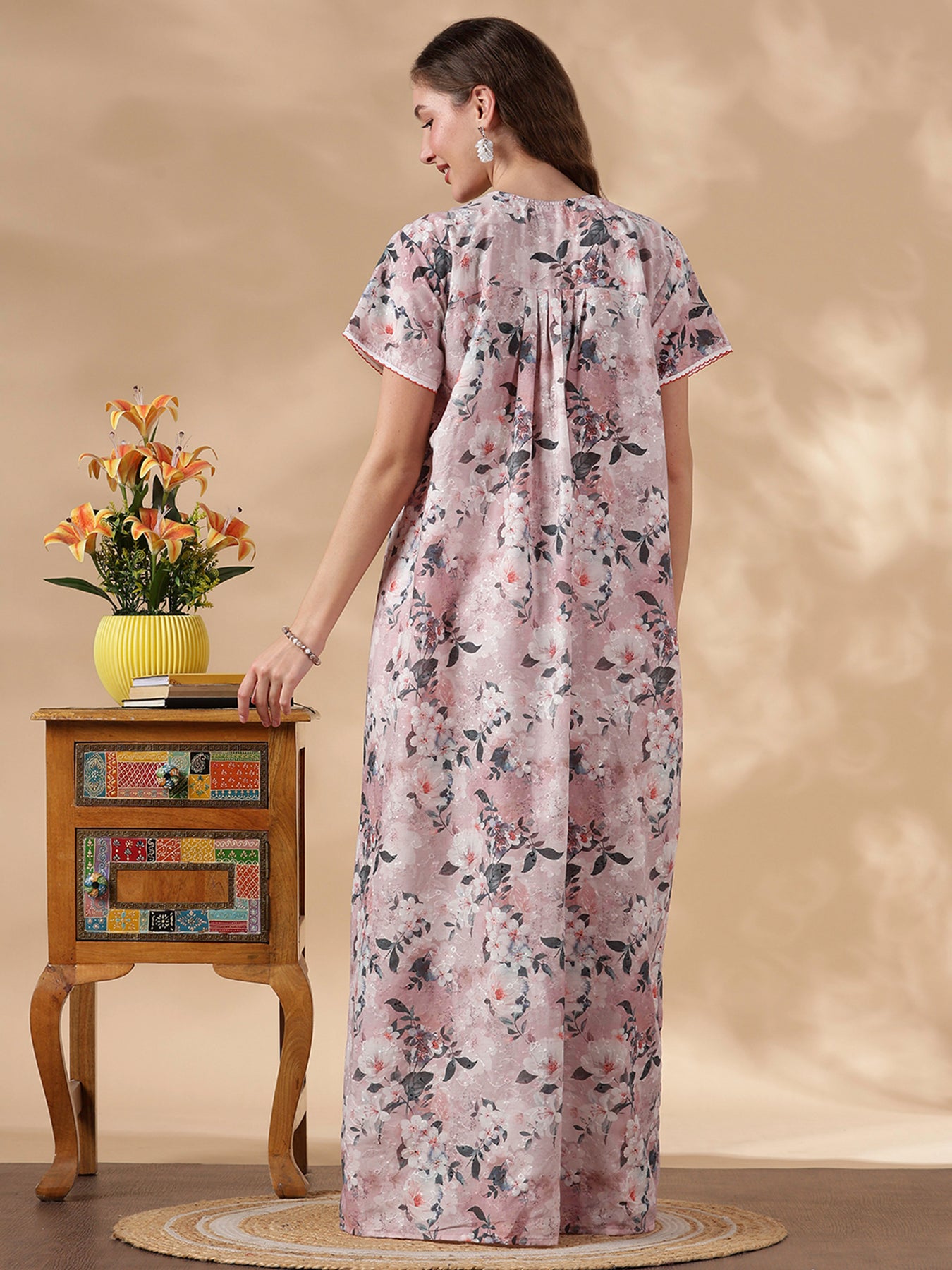 Pure Cotton Embroidered Nighty for Women in Dusky Bloom