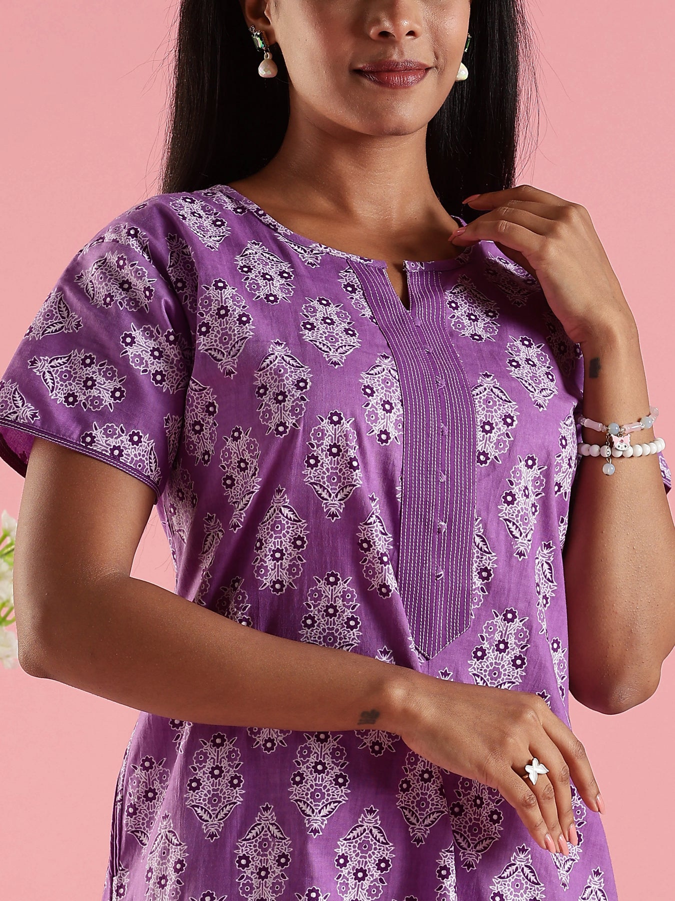 Cotton Nighty for Women in Purple with Printed Design and Pocket