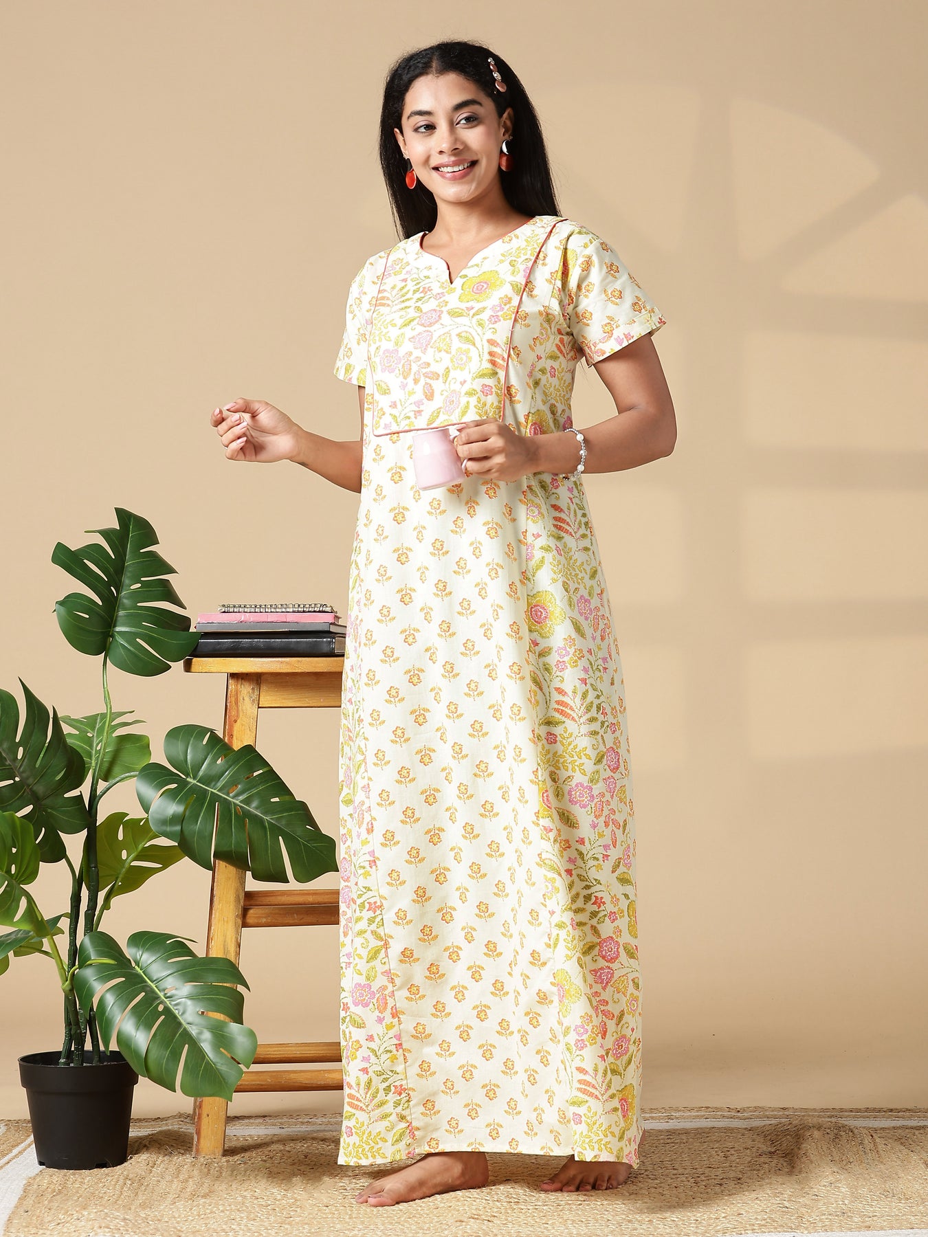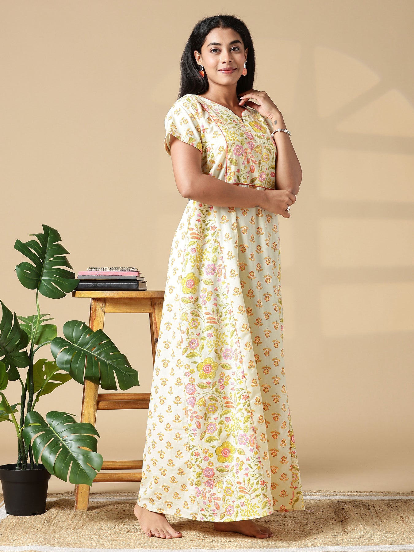Pure Cotton A-Line Yellow Nighty for Women with Traditional Print