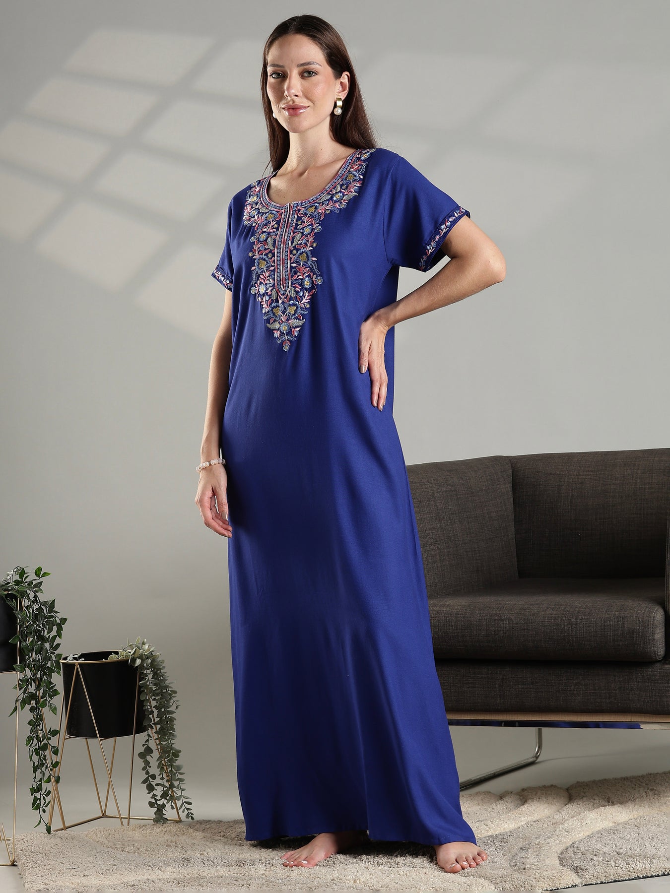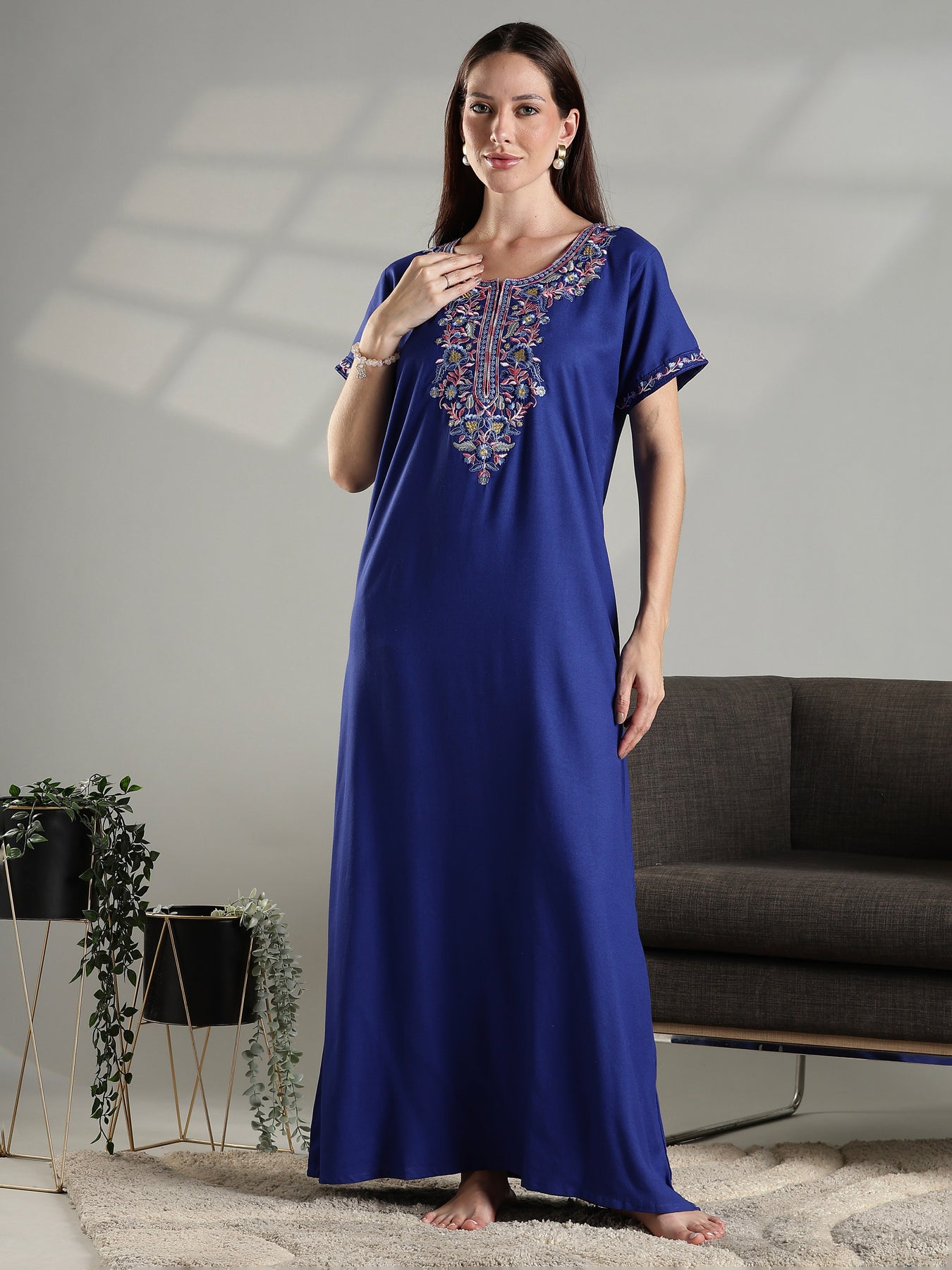 Experience effortless elegance with this Royal Blue Alpine nighty for women, designed to bring together premium comfort and refined style. The rich solid tone paired with intricate embroidery makes it perfect for both relaxing evenings and cozy nights. Its breathable alpine fabric and flowy silhouette ensure you feel relaxed, confident, and stylish at home.