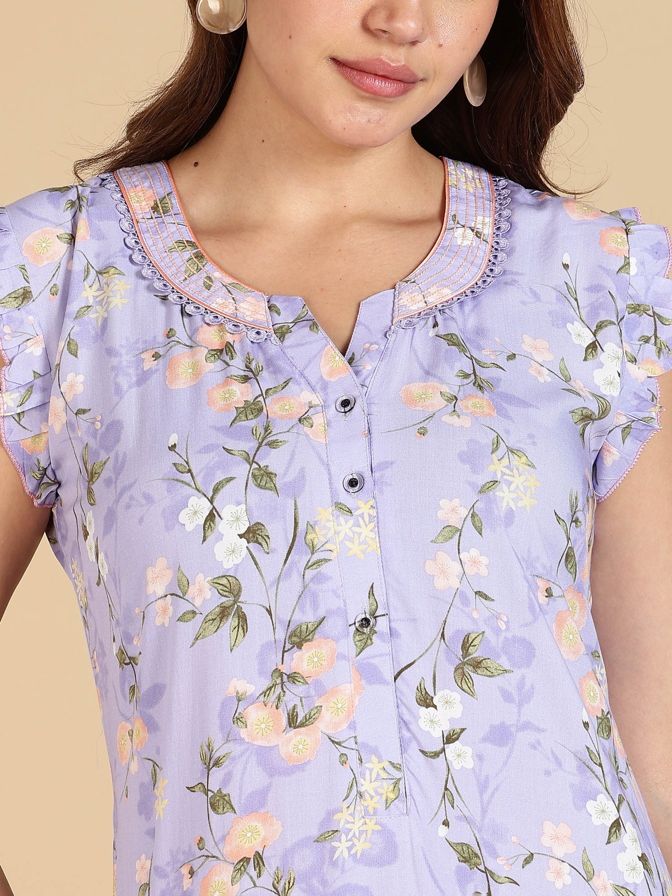 Lavender Rayon Floral Sleeveless Nighty for Women