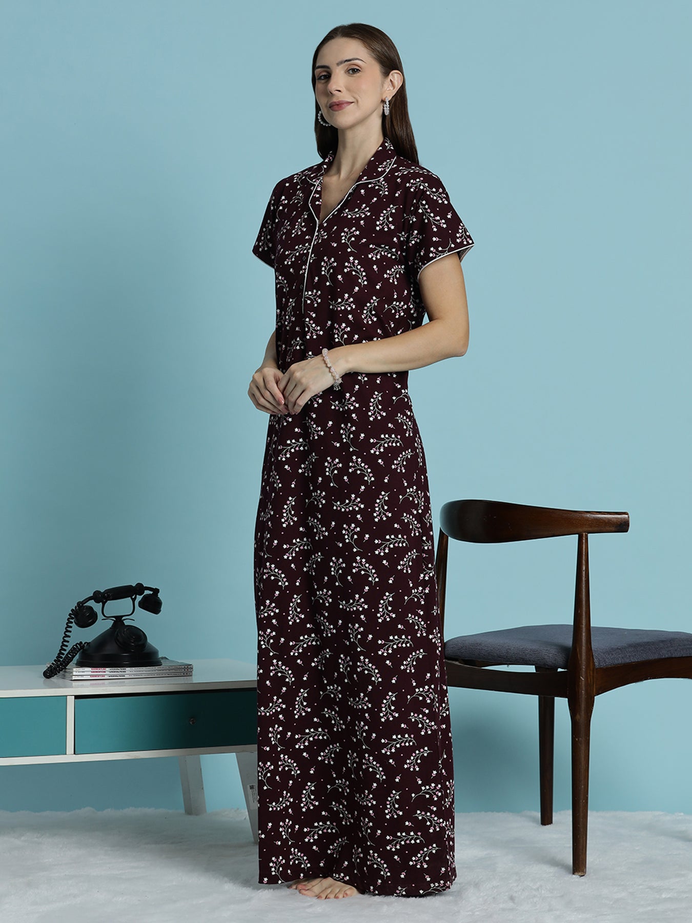 This wine bloom nighty is designed for women who want softness, coverage, and comfort without compromise.